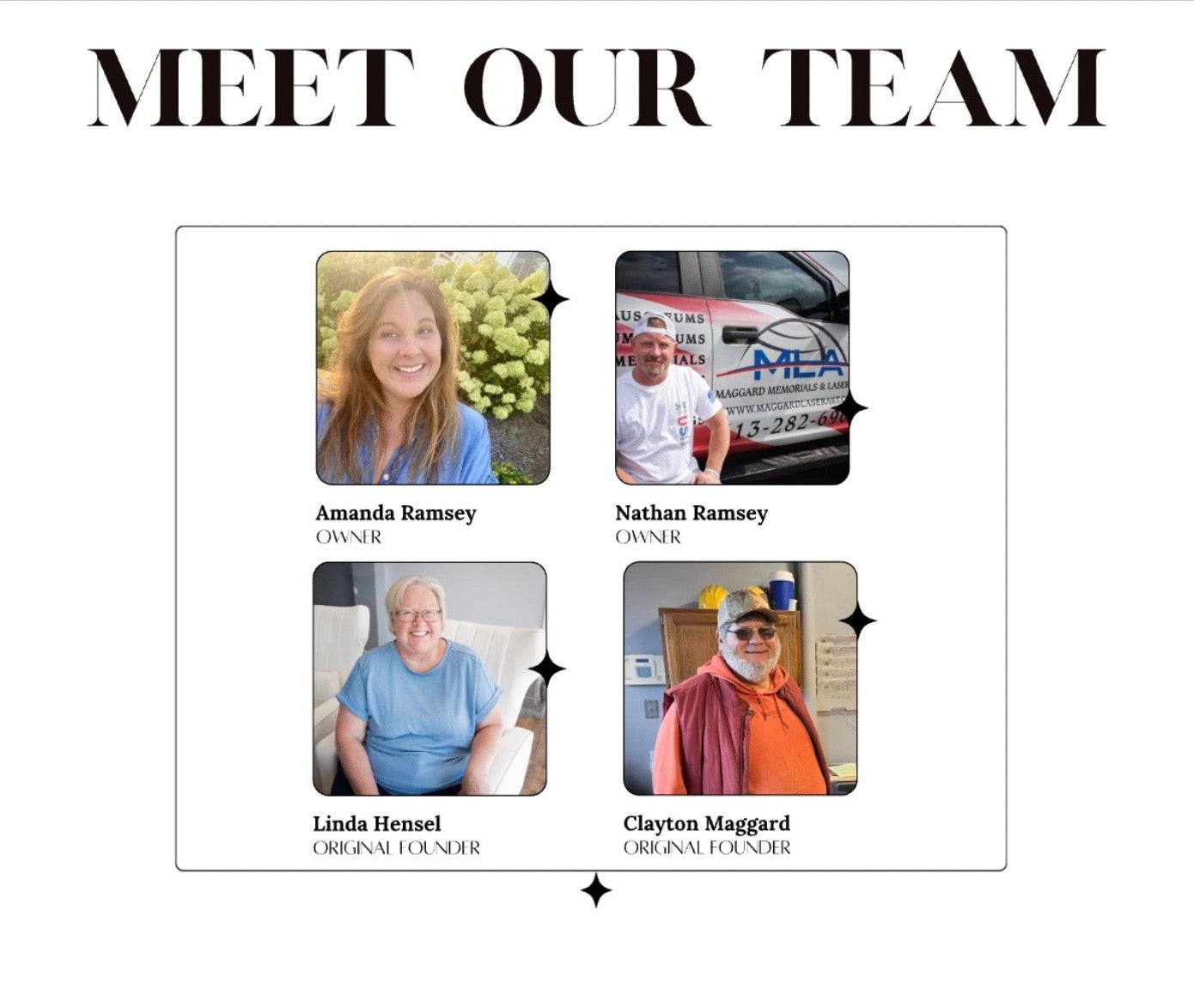 At Maggard Memorials, our team is more than just skilled professionalsβweβre compassionate individuals dedicated to helping families honor their loved ones with care, respect, and craftsmanship. With decades of combined experience in memorial design and service, we take pride in guiding each family through the process with empathy and attention to detail. Whether you're choosing a monument, customizing a tribute, or simply looking for support, we're here to help every step of the way.